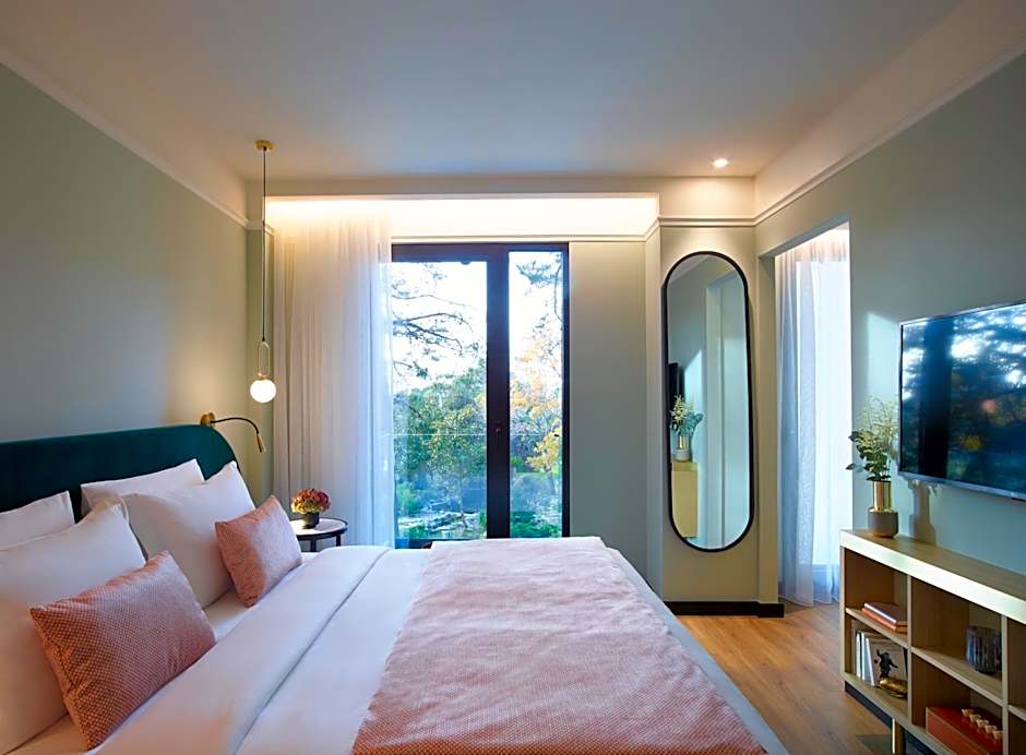 This suite features a bedroom and a separate living room, floor-to-ceiling windows in the bathroom and private balconies overlooking a private garden.